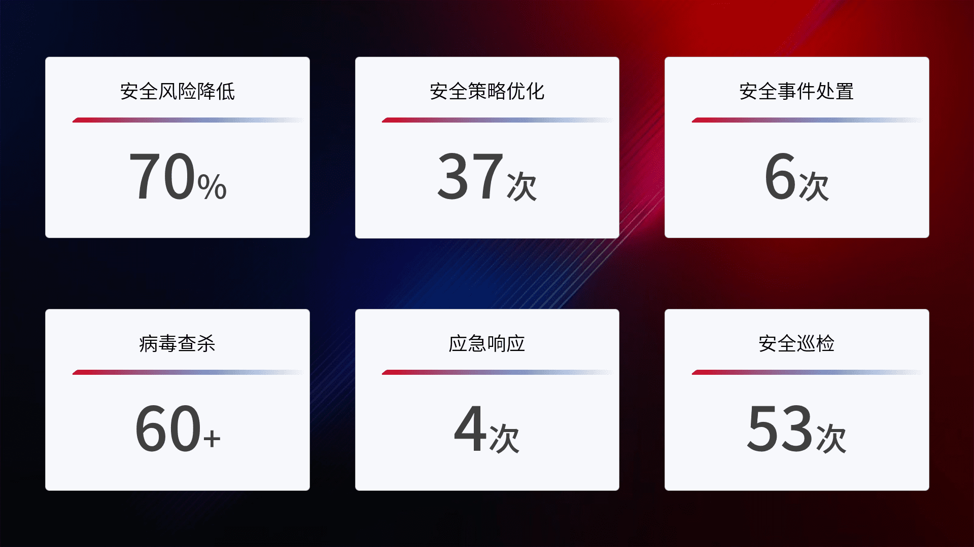 提供全面的安全事件报告体系,,包括处置报告、、、、周报、、、、季度和年度总结,,结合持续监控,,,帮助客户深入了解网络安全状况。。