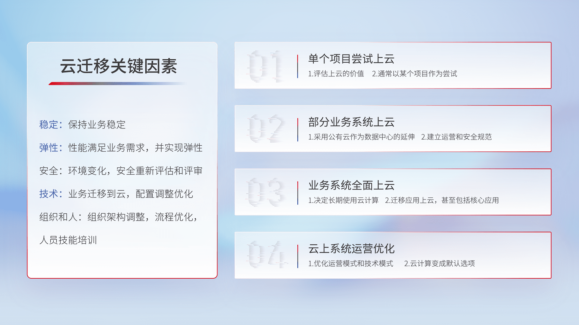 结合实际业务,,,从规划设计、、云平台选型、、、云原生改造、、数据迁移、、、集成交付,,迁移全过程为客户识别最佳上云路径,,,做好风险识别管理,,,设计网络架构、、、、身份权限、、、、安全审计合规、、、操作审计、、、日志审计、、、、监控告警策略、、多站点容灾设计等,,对云上基础设施进行整体规划,,提升IT治理水平,,以满足弹性、、、高可用、、、、高性能的需求。。。。