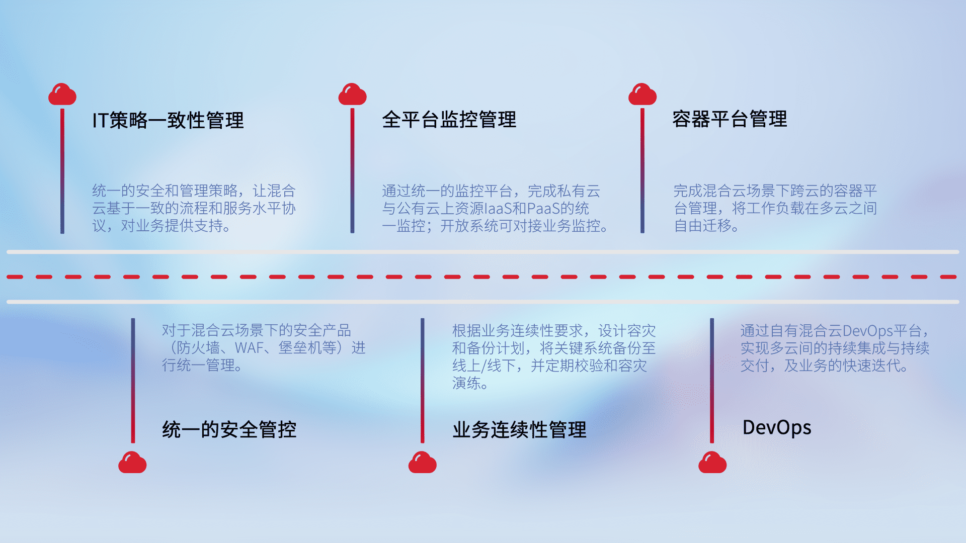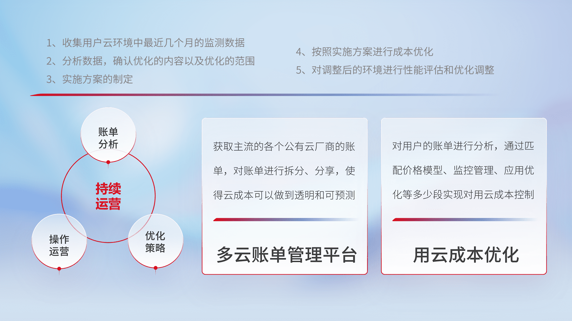 通过多云纳管,,,以统一的资源数据模型把客户的云资源进行抽象和封装,,进而实现对多云资源的统一操作,,,,保障云资源管理的可靠性、、、、稳定性与可用性。。。量身定制化运维内容,,,配置、、、开发运维、、、补丁管理、、备份、、、、监控、、、认证和访问管理、、、审计和日常巡检等,,,保障在用云过程中的可靠度,,,,稳定度以及高可用率。。。