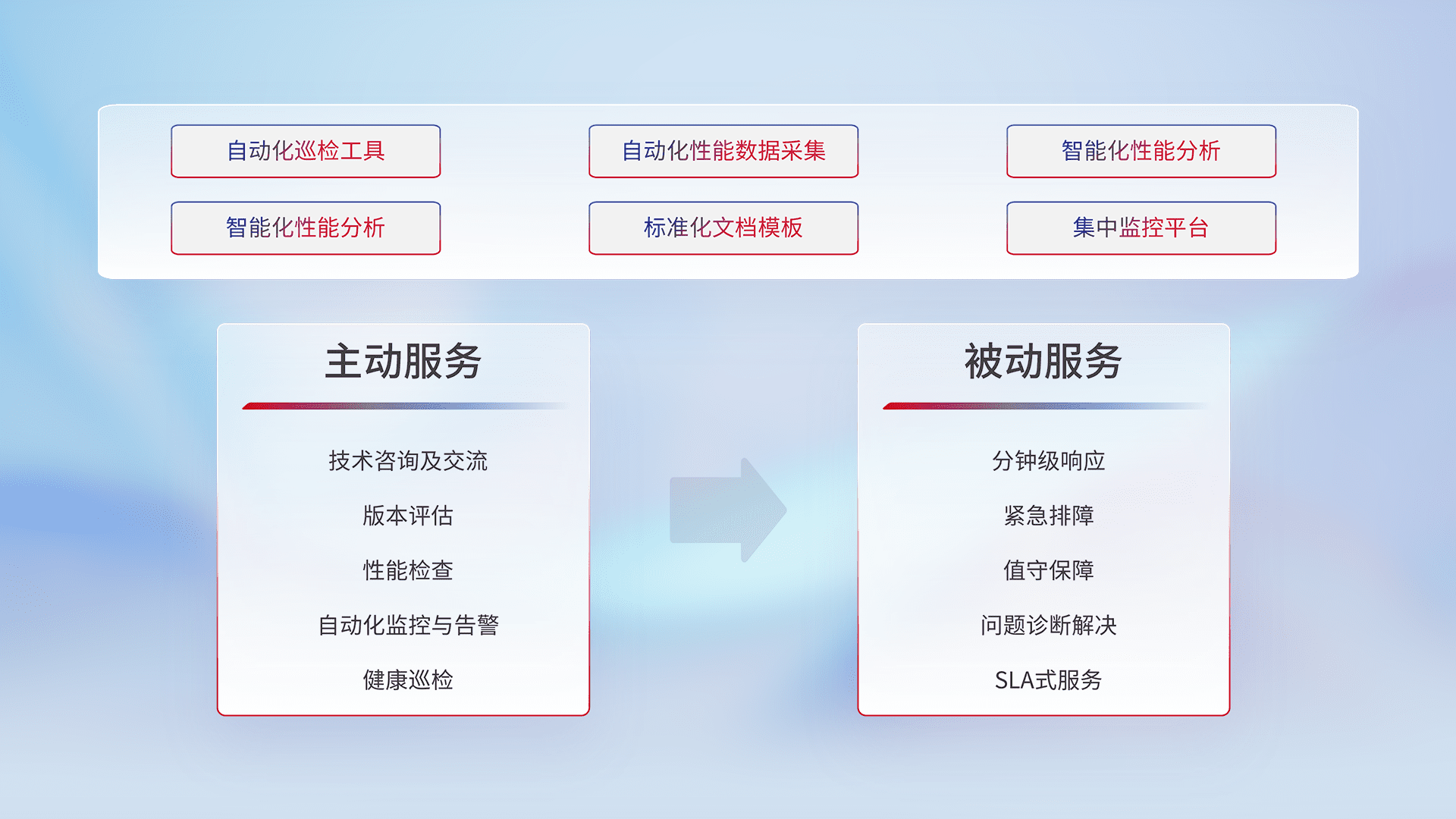 智能化工具和标准化文档,,保障服务质量,,,,提供主动服务(包含技术咨询、、版本评估、、性能检查、、、、自动化监控与告警、、健康巡检)和被动服务包含(分钟级响应、、、、紧急排障、、、值守保障、、问题诊断解决、、、、SLA服务)。。